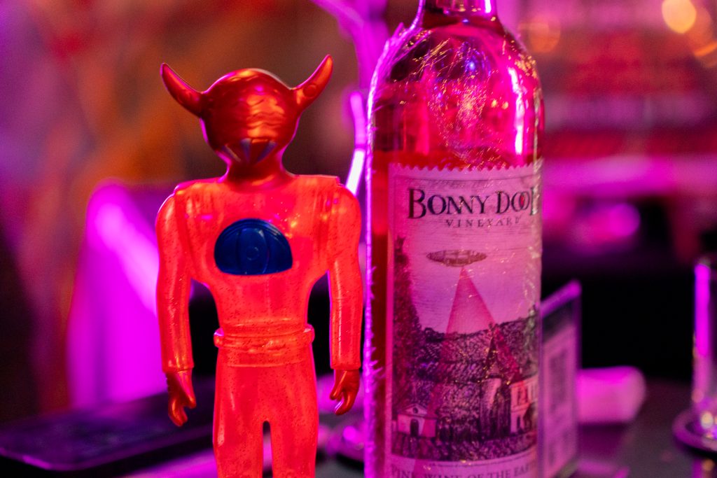 自然志向やニューエイジといったヒッピー・ムーブメントの思想が、冷戦やベトナム戦争といった現実社会からの逃避として、UFOを違和感なく受け入れていった歴史的背景があると話され、ラベルにUFOが描かれているアメリカ・カリフォルニア州のワイナリー「ボニードゥーン(Bonny Doon)」のワイン「空飛ぶ葉巻」の実物を持参された。